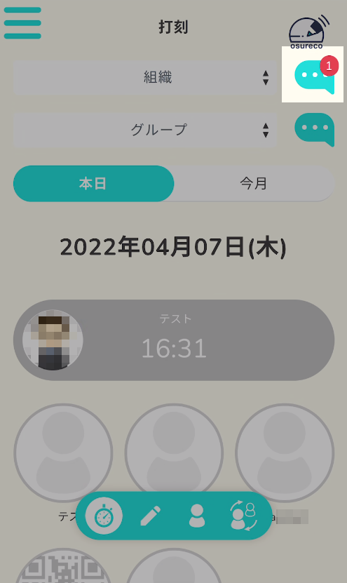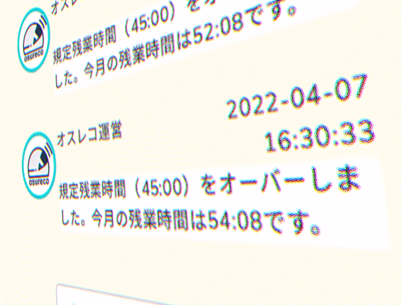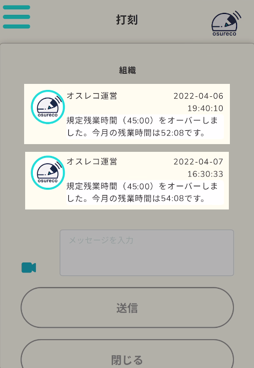 メッセージを開くと今月の合計残業時間が表示されます。