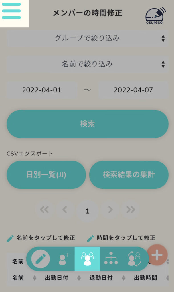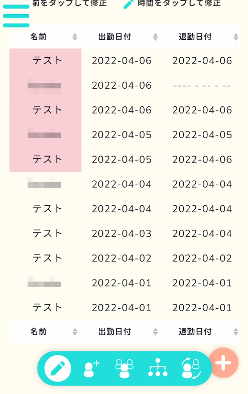 時間一覧表示の画面で、残業時間をオーバーしたユーザーが