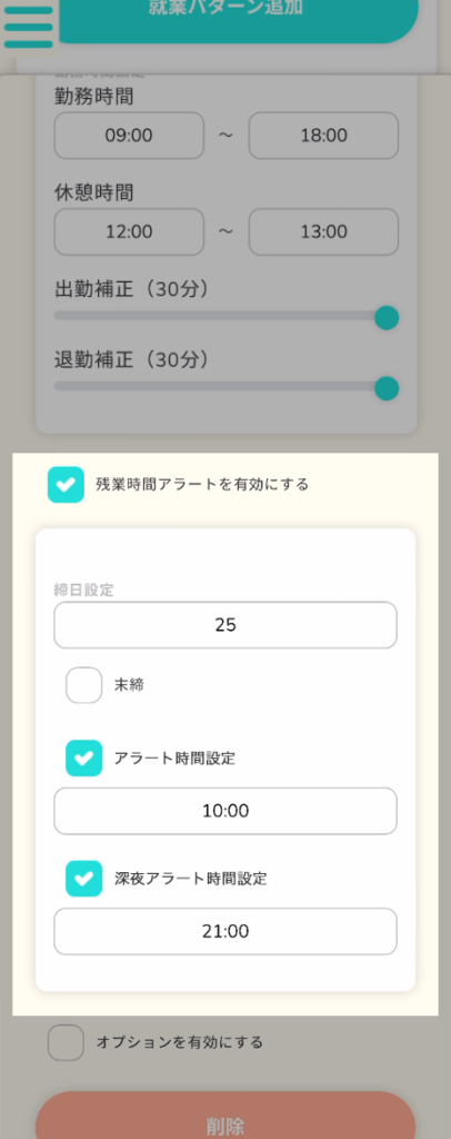 残業時間アラートの設定項目が出てくるので設定します。