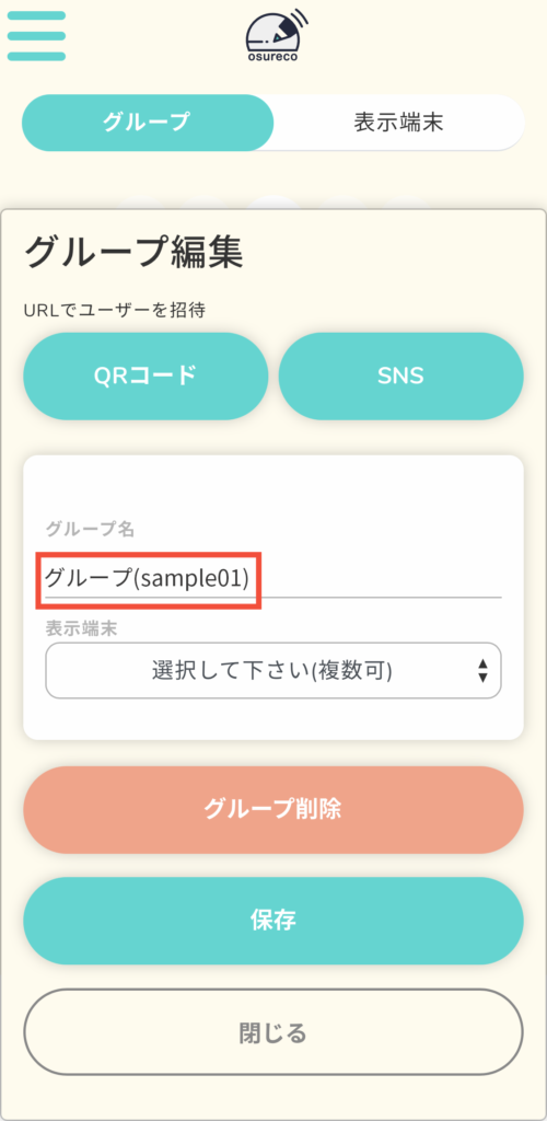 「グループ(sample01)」を押すと入力欄が表示されますので自由なグループ名を入力します。