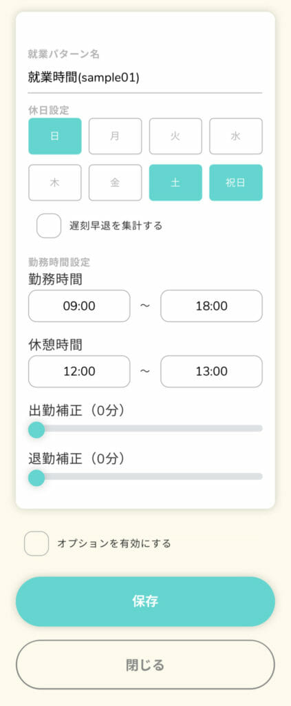 就業パターン名、休日、勤務時間、休憩時間を任意のものに変更して「保存」します。
