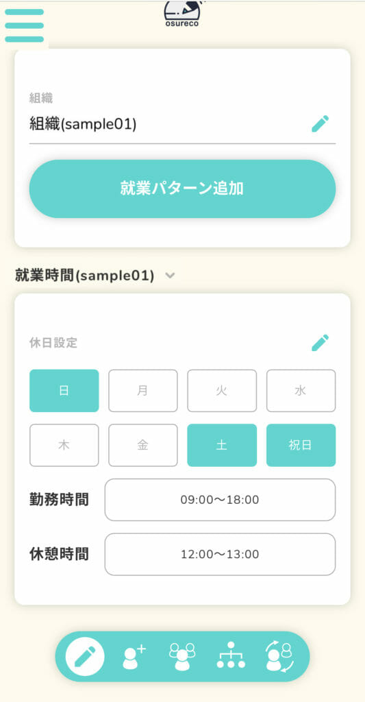 休日設定や勤務時間、休憩時間の現在の設定が表示されます。