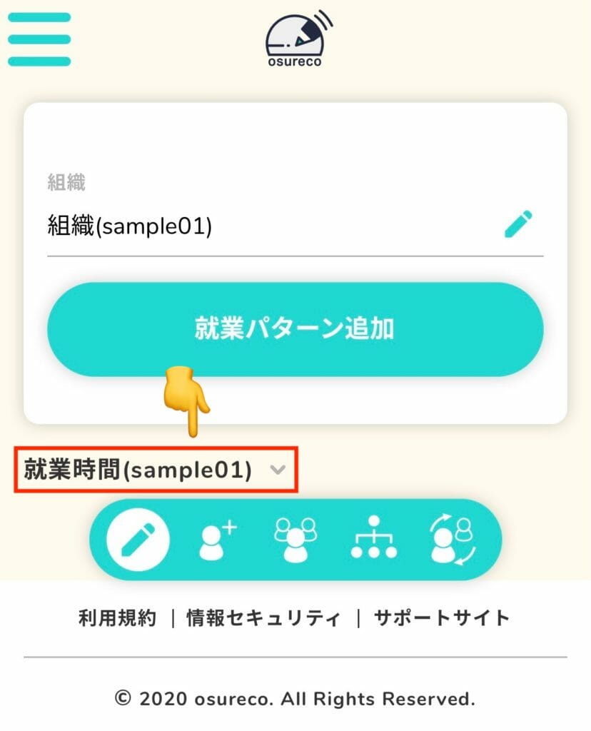 組織名を変更する画面で「就業時間(sample01)∨」を押します。