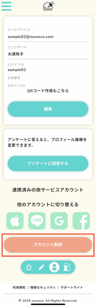 よくある質問 基本的な使い方 【良くある質問】解約方法 2020.09.29 解約方法 オスレコを解約する方法です。解約すると記録データ含めて全てのデータが削除されます。 目次メニューアカウント削除ボタン確認画面完了 一般ユーザーのメニューを表示します。プロフィールの編集をタップします。 プロフィールの編集画面を一番下の方までスクロールすると「アカウント削除」がありますのでタップします。 本当に削除しますか?と確認アラートが出ますので、問題なければ「アカウント削除」をタップします。 「メンバーを削除しました」のメッセージが出たら削除完了です。