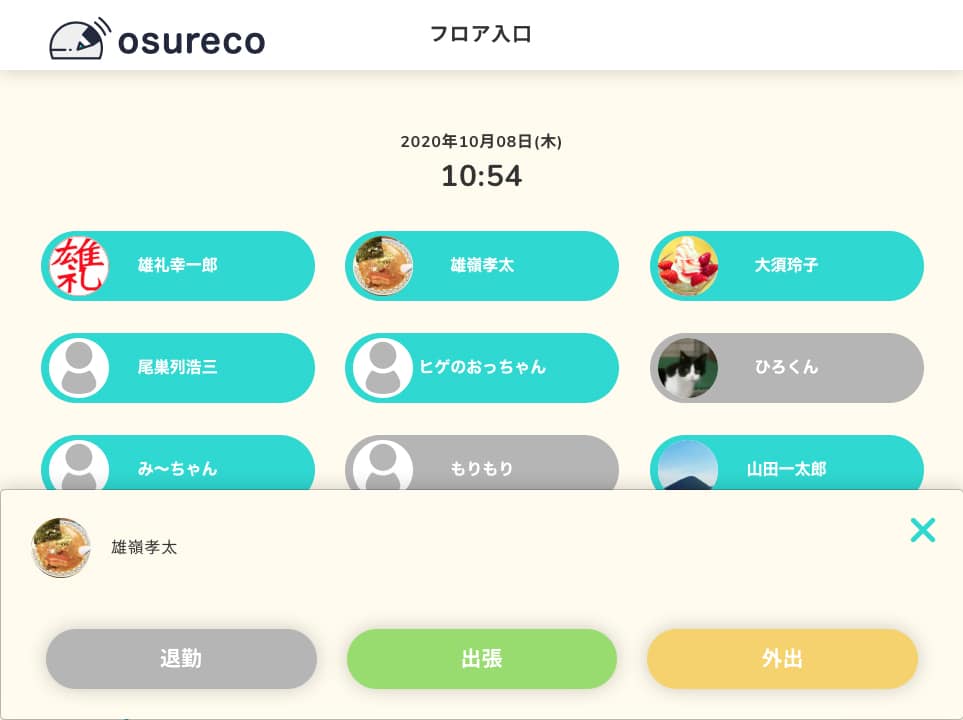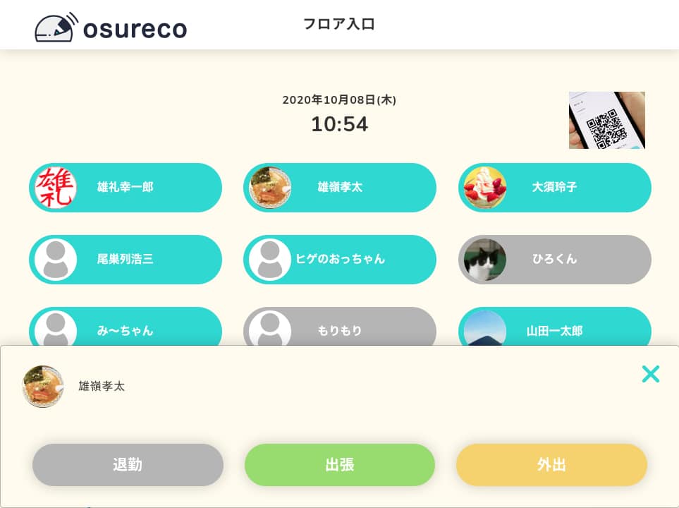 ボタンを押しても、QRコードをかざしても出退勤が可能です。