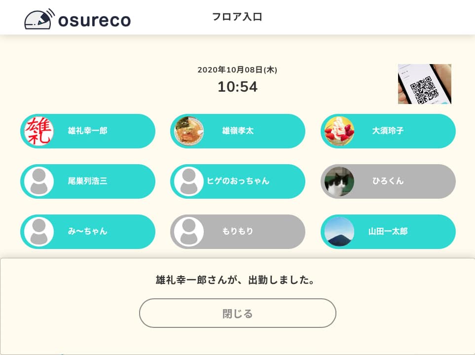 設定が完了した共用端末ではQRコードをかざす事で出勤⇔退勤の記録が可能です。