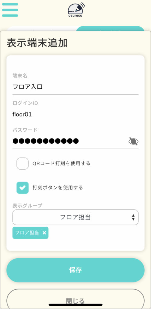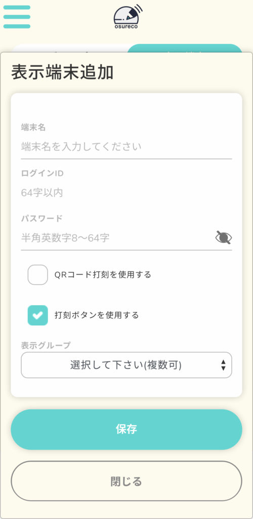 端末名や端末のログインID、パスワードを新たに入力し、表示グループを選択し設定します。表示グループは複数選択可能です。