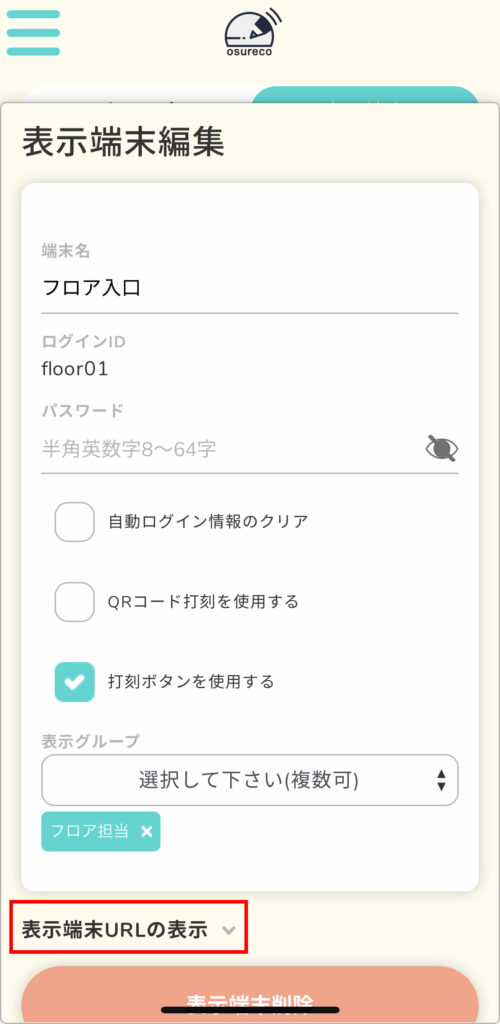 下の方にスクロールすると「表示端末URLの表示」がありますので、押します。