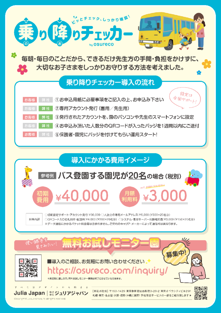 株式会社ジュリアジャパン(本社:東京都新宿区、代表取締役:田中 直之、以下ジュリアジャパン)は昨今のバス置き去りによる悲しい事故をデジタルの力で無くしたいとの思いから、