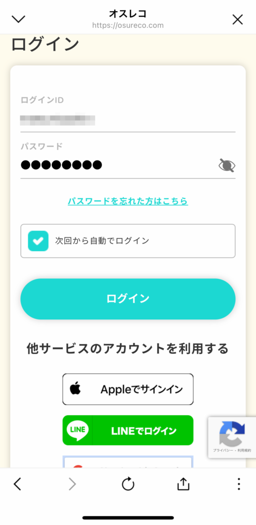 オスレコのログイン画面が表示されるのでログインIDとパスワードを入力して「次回から自動でログイン」にチェックをつけてログインボタンをタップします。