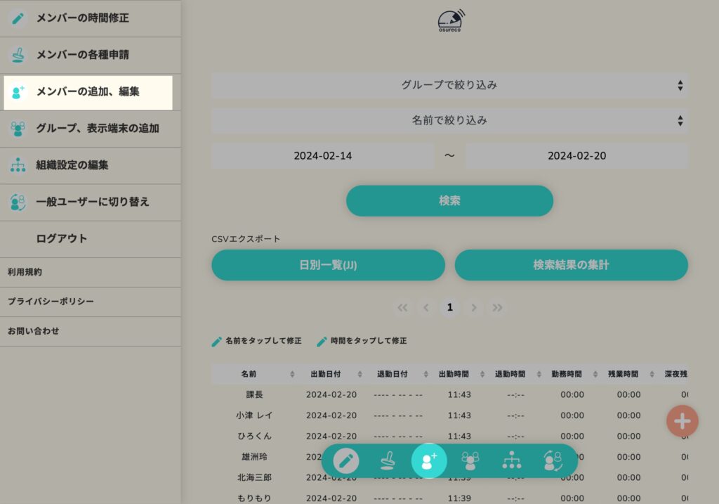 「メンバーの追加、編集」メニューを押すとメンバー一覧が表示されます。