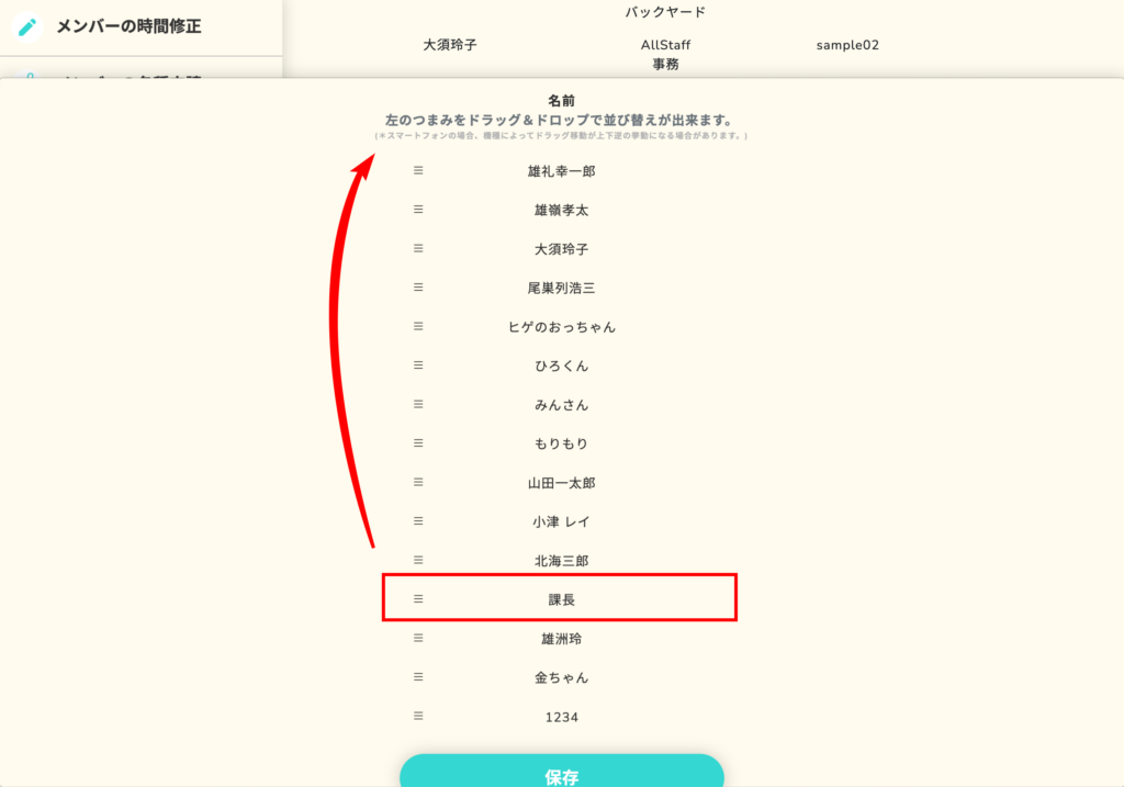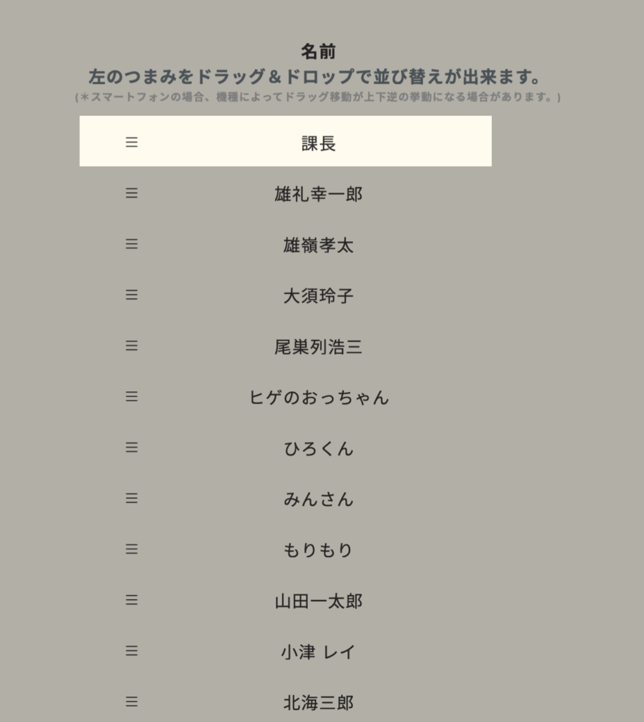 並べ替えはスマホでも可能ですが、登録人数が多い場合、移動時のドラッグとスクロールの挙動が区別できなくなる一部の端末がありますので、その場合は上下逆の動きで対応してください。