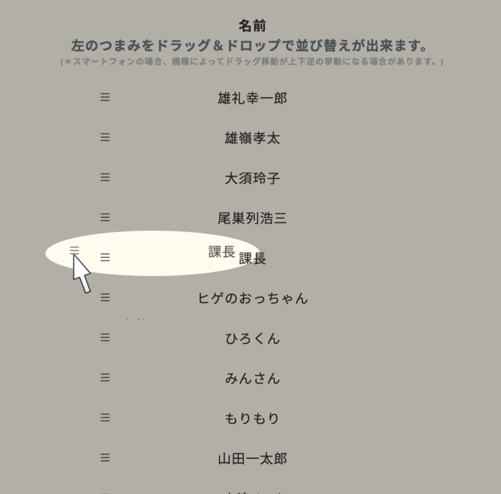 並べ替えはスマホでも可能ですが、登録人数が多い場合、移動時のドラッグとスクロールの挙動が区別できなくなる一部の端末がありますので、その場合は上下逆の動きで対応してください。